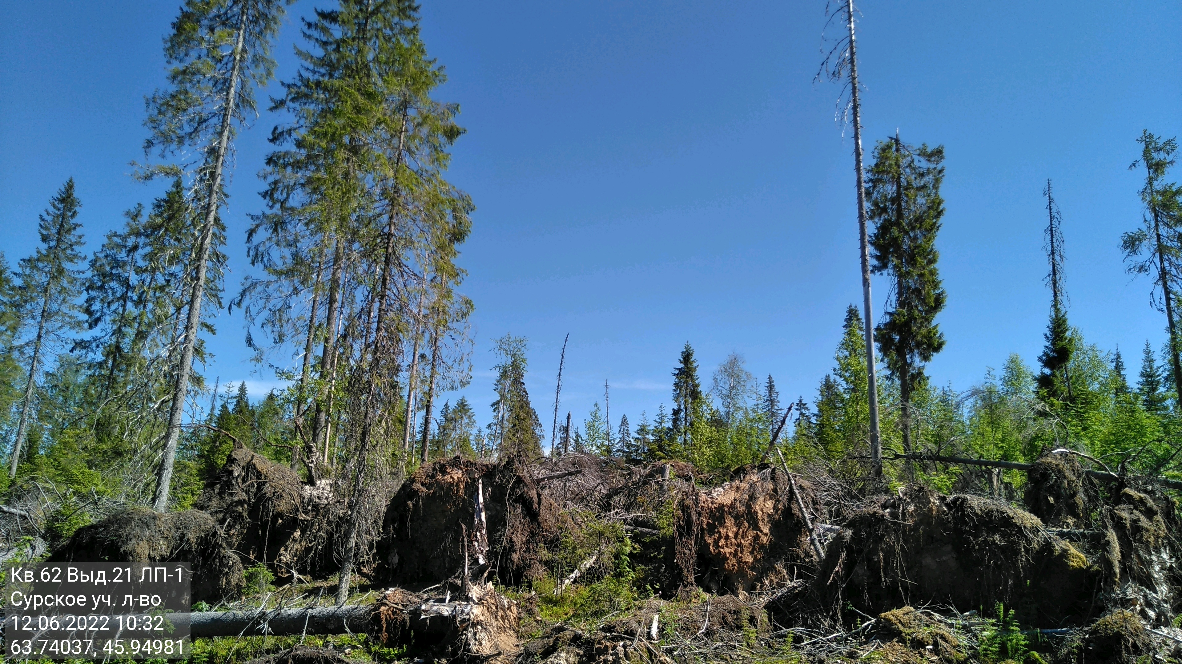 В июле 2020 года на территории нескольких лесничеств Архангельской области в следствии шквалистых ветров пострадали насаждения на площади около 18 тыс. га. В результате неблагоприятного природного фактора наиболее пострадали насаждения Березниковского и Сурского лесничеств. Инженеры-лесопатологи филиала ФБУ «Рослесозащита» - «ЦЗЛ Архангельской области» в целях выявления ухудшения состояния насаждений, поврежденных шквалистыми и ураганными ветрами прошлых лет, определения численности вредителей и назначения санитарно-оздоровительных мероприятий, необходимых для предотвращения возникновения очагов вредителей и болезней леса, продолжают проведение работ по лесопатологическому обследованию лесных насаждений на территории Сурского лесничества Архангельской области. По договору с ЗАО «Лесозавод 25» инженеры-лесопатологи ФБУ «Рослесозащита» – «ЦЗЛ Архангельской области» провели лесопатологическое обследование на общей площади 581,3 га. В обследуемых насаждениях наличие погибших деревьев cоставило более 50% от запаса насаждения, поврежденного в результате воздействия сильных ветров. В связи с этим, лесопатологическое обследование проведено преимущественно визуально. Обследуемые участки леса по таксационному описанию относится к эксплуатационным. По результатам лесопатологического обследования большая часть насаждений относятся к сильно ослабленным и усыхающим (средневзвешенная категория состояния от 2,6 до 3,7). Процент отработанной короедом-типографом древесины составил от 20 до 40%. Для ликвидации последствий ветровала, предупреждения формирования очага насекомого-вредителя, инженерами-лесопатологами рекомендовано проведение сплошной санитарной рубки на площади 577,8 га. Также стоит отметить, что наиболее пострадавшие участки леса в Сурском лесничестве, находящиеся в аренде, планируются к разработке в ближайшее время (осень-зима 2022-2023 гг). В течении выполнения лесопатологического обследования вся соответствующая информация о насаждении включена в реестры государственного лесопатологического мониторинга. В установленные сроки акты лесопатологического обследования будут отправлены в министерство природных ресурсов и лесопромышленного комплекса для утверждения.